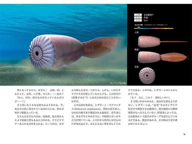 おお! そこに気づいていただければ。実は、本として楽しむ形っていうのがコンセプトとしてはあります。ページをめくった時にサイズ感の違いを感じてもらいたいんです。例えば、アノマロカリス。前ページのオパビニアを見てから見ると、同じ時代でいかにアノマロカリスが大きいかがわかります。これって本だからこそできると思うんですよね。なので、一枚絵で楽しむよりも、ページをめくりながら楽しんでもらいたいです。