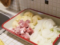 たまねぎ 十ぷん おにくは 二ふん いためて いためて それから あとは にんじん すって 入れましょう お水を 入れて にたたせて じゃがいも さいごに 入れるのね