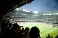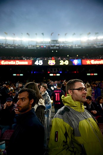 数日後、今度はバルセロナで試合を観戦した時のことだ。試合前にメッシの500ゴールを祝うセレモニーが開催され、空を見上げると巨大な旗が観客の上を覆いかぶさるかのようにはためいていた。そういう一瞬に出会えた時は、アドレナリンが全開になって写真を撮るのがとても楽しい。