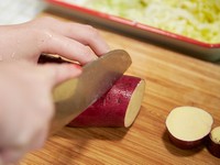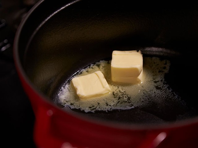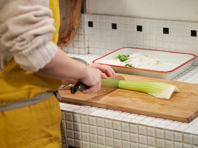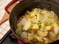 私は、厨房にある野菜の中から次々と選んでそれらを細かく刻み、火の通りにくいものから順にバターで炒めた。