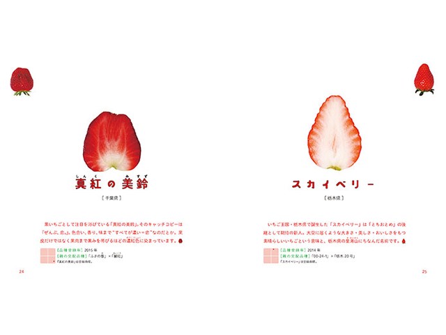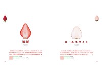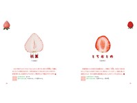 本書は、現在日本で栽培されているイチゴの中から、私たちが店頭やイチゴ農園などで目にする42品種のイチゴを“断面”で紹介。断面になっていることで、イチゴの形や中身の違いがよくわかります。この図鑑を最初から最後までじっくりと見ていると、イチゴの断面の白い部分と赤い部分のバランスや白い筋の入り方など、これまで気にもとめなかったところが気になってくるはずです。