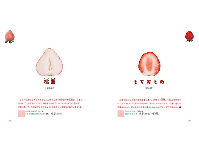 イチゴの断面図に加え、生産地や品種登録年、親の交配品種も掲載されているので、それぞれのイチゴの系統についても知ることができます。本書に収録されている品種以外にもイチゴの品種はまだまだあり、新しい品種も誕生し続けているとのこと。農家さんの企業努力には頭が下がる思いです。