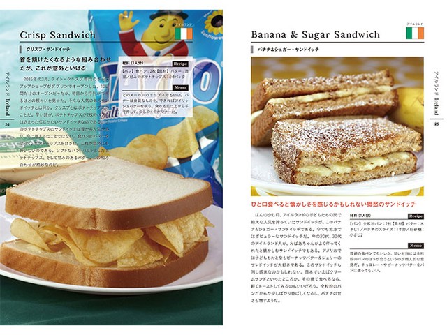 個人的に作ってみたいと思ったのが、バターを塗ったパンでポテトチップスを挟んだだけという、アイルランドの「クリスプ・サンドイッチ」。わりと昔から人気があるものだそうで、パンの柔らかさとポテトチップスのパリッとした食感、甘みのあるバターの組み合わせが絶妙なんだとか。本書で取り上げられている、イングランドの「チップ・バティ」(フライドポテトを具材にしたサンドイッチ)の派生系ともいえるのかもしれません。いずれにせよ、アイルランドやイギリスはジャガイモが国民食なのだと妙に納得してしまいました。
