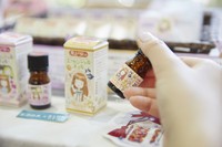 会場の入り口では『なんでも魔女商会』に登場する召使いのネコ「コットン」がお出迎え。その向かいでは、期間中、会場限定で販売されているオリジナルグッズ売り場があり、かわいらしいイラストがあしらわれたマスキングテープやクリアファイルなどのほか、作品をイメージしたアロマスプレーなど、見ているだけできもちが上がる商品が並んでいる。