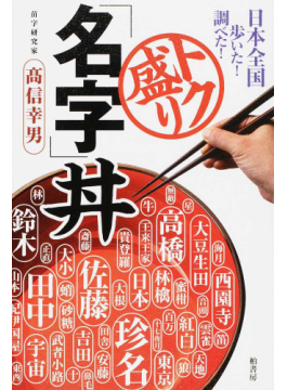先生(せんじょう)、林檎(りんご)、百足(むかで)、四月一日(わたぬき)……。日本全国の名字の情報を載せた『トク盛り「名字」丼』(柏書房・1836円)。著者の「苗字(みょうじ)研究家」髙信幸男氏が電話帳などをもとに調査。難読、珍名、全国名字ランキング、動植物や食料品ゆかりまで、名字の由来や逸話が盛りだくさん。=朝日新聞2019年8月17日掲載