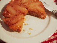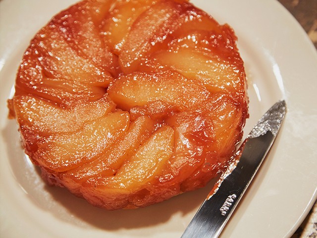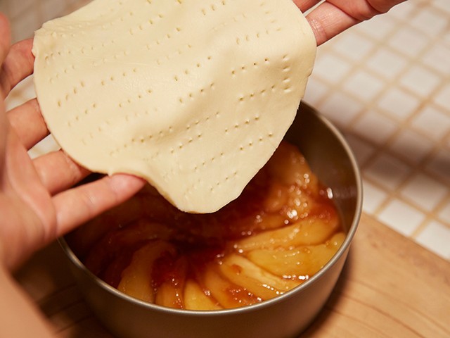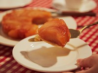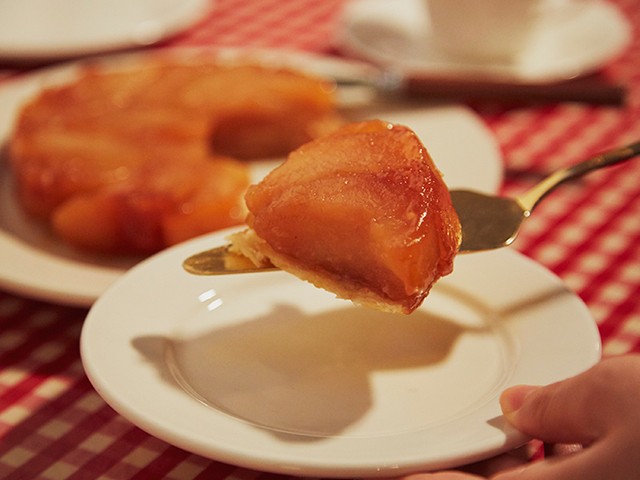 型にキャラメリゼしたリンゴを敷き詰め、その上にタルト生地をかぶせてオーブンで焼くのがタルト・タタン。焼きあがったら、型をひっくり返してキャラメル色のリンゴ部分を上にして食べるものです。