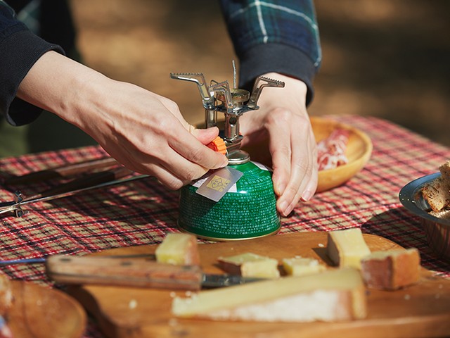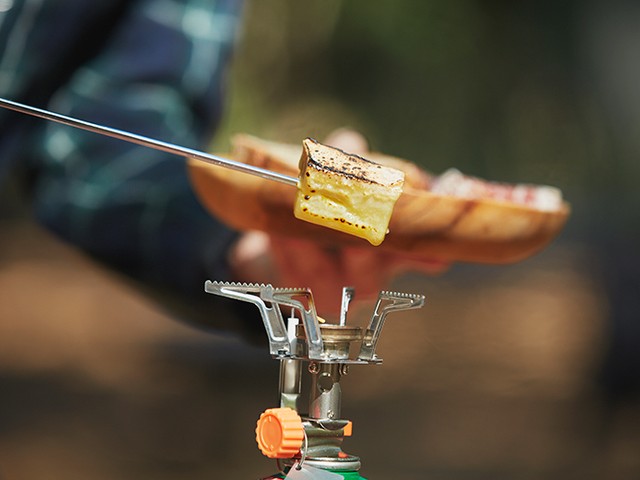 とろ〜りととろけてくれそうなラクレットチーズを串に刺し、ガスバーナーであぶってみます。なかなかいい塩梅にはとろけてくれませんが、焼きチーズの香ばしい香りが鼻をかすめてきたら、そろそろ食べごろです。