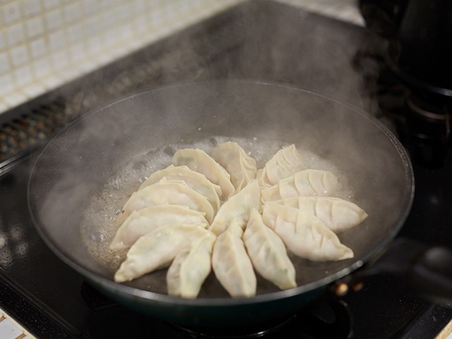 そんな森宮さんの言葉を信じて、本作に登場した4種類の具材を用意し、ひたすら餃子の皮で包んでいきます。全餃子が並んだ姿は圧巻! フライパンに並べて蒸し焼きにすると、「ジュウゥ……」という食欲をそそる音が聞こえてきます。