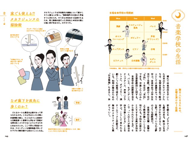そんなタカラヅカの魅力をかわいいイラストとユニークな解説で紹介するのが「タカラヅカの解剖図鑑」です。本書は、お互いタカラヅカの大ファンだという、演劇ジャーナリストの中本千晶さんとイラストレーターの牧彩子さんによるタカラヅカガイドの決定版。男役や娘役、各組の特徴などの解説にはじまり、宝塚音楽学校のスターを育てる仕組み、バラエティに富んだ作品などの紹介を通して、広く深くタカラヅカの世界へと誘ってくれます。