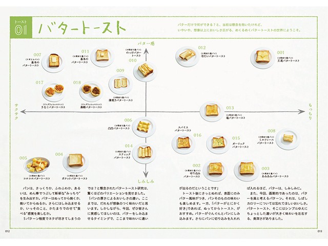 面白いのが単なるアレンジレシピの紹介にとどまらないところです。例えば、バタートーストでは、18種類に及ぶ食べ方を提案し、その味わいや食感の違いをチャート図にまとめています。パンの厚さや表面に入れる切り込み数の違い、バターを塗るタイミングはトースト前なのか後なのか、はたまたバターを具ととらえてパンの切り込みにインしてみるなど、まさに“研究”という言葉がぴったりです。金子さん曰く、特にバターをしみ込ませるタイミングによって味わいに差があるのだそう。パンそのものの味も楽しみたいならトースト後、バター好きならトースト前にバターを塗るのがおすすめなんだとか。