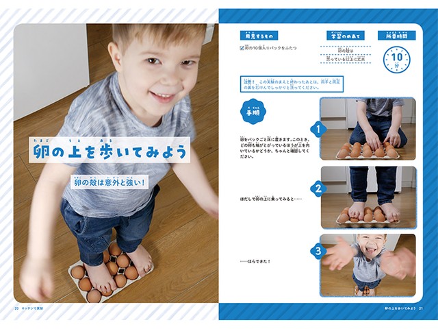 例えば、卵の上に乗ってみる実験。落としたり叩いたりすると簡単に割れてしまう卵に、子どもだけでなく、大人も乗ってみようという、なかなか緊張感ある実験です。パックに入ったままの卵を端がとがっている方が上を向いている状態で床に置き、あとは乗ってみるだけ。小さな子どもはもちろん、大人が乗っても割れないといいます。