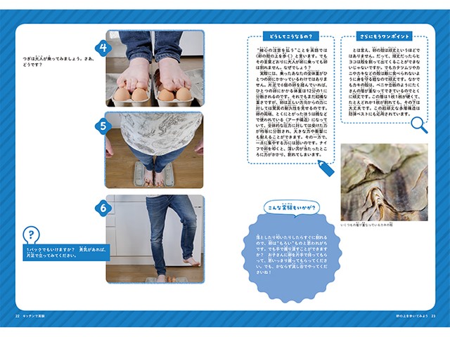 本書では、実験のやり方だけでなく、実験で見られる不思議な現象についての科学的な理由も解説。先に挙げた卵が割れない理由は、卵の構造にあるんだとか。卵のようにカーブを描いた「アーチ構造」は、同じ方向から受けた力が均等に分散されるため、大きな力や衝撃にも耐えられるんだそう。このアーチ構造が橋やダムなどの建築物にも応用されていると知れば、科学がより身近な存在にもなります。
