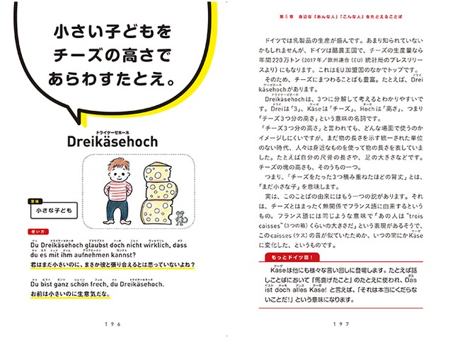 酪農王国でもあることから、「チーズ(Käse、ケーゼ)」を使った表現も豊富にあるんだとか。「小さな子ども」を指す「Dreikäsehoch(ドライケーゼホーホ)」は、直訳では「チーズ3つ分の高さ」という意味の言葉。ドイツでは、統一の単位がまだない時代にチーズの塊で長さや高さを表していたんだそうです。他にも、直訳すると「チーズのように真っ白な」で「恐怖や怒りで顔色が悪い」という意味の「Käsebleich(ケーゼブライヒ)」、「チーズ足」で「臭い足」を指す「Käsefüße(ケーゼフューセ)」などがあるといいます。