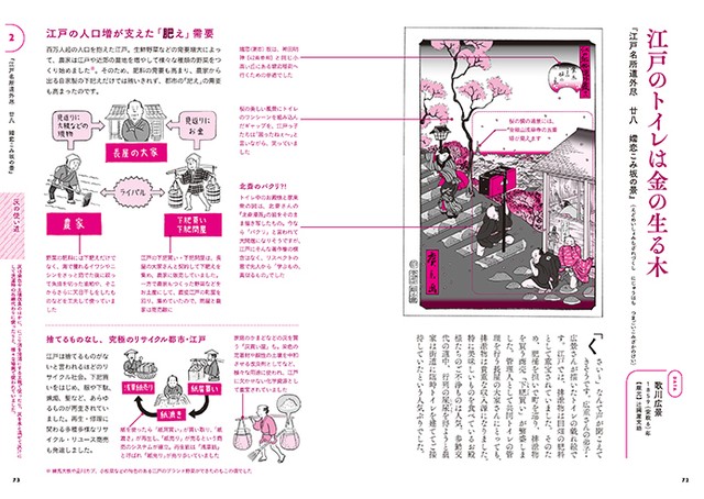 美しい桜の風景にトイレシーンを組み合わせてくるあたりに江戸っ子の遊び心を感じつつも、江戸時代から公衆便所があったことに驚かされました。江戸では排泄物は田畑の肥料として重宝されており、排泄物を買い取る「下肥(しもごえ)買い」という商売が繁盛していたとのこと。排泄物は長屋の共同トイレを管理する大家さんにとっても収入源の一つになっていて、そんな“宝物”を集めようと寺社の参道には私設の公衆トイレがあったり、参勤交代の道中には農家がこしらえた臨時トイレがあったりしたんだそうです。