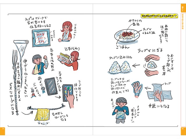 中でもさまざまなことに使えてポテンシャルの高いアイテムがラップです。包帯や三角巾代わりにしたり、ねじってロープにしたりと、本書で取り上げられている使い方だけでも10通りもあります。工夫次第では、他にもいろんな使い方ができそうです。