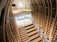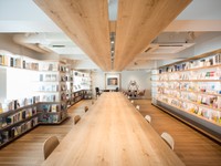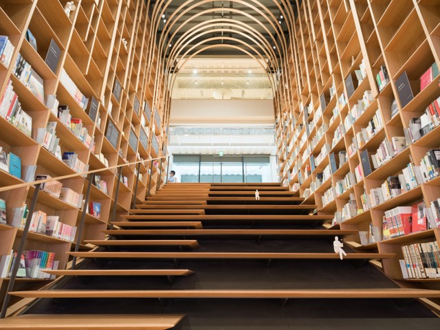 館内に一歩足を踏み入れると、1階と地下1階をつなぐ「階段本棚」が見えます。2階まで吹き抜けになっていて、アーチ状の天井と、左右にずらりと並んだ本棚に圧倒されます。