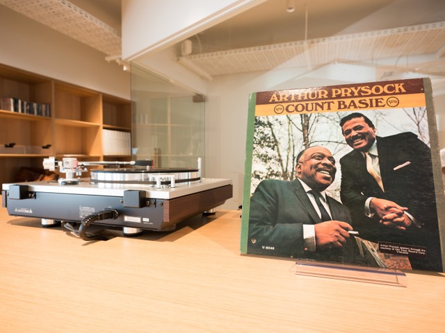 プレーヤーやアンプ、椅子は村上さんの書斎と同じ製品で、机の素材やソファ、絨毯は似たものを使用しています。壁面のレコード棚には順次、村上さんから寄託、寄贈されるレコードが並ぶ予定といいます。