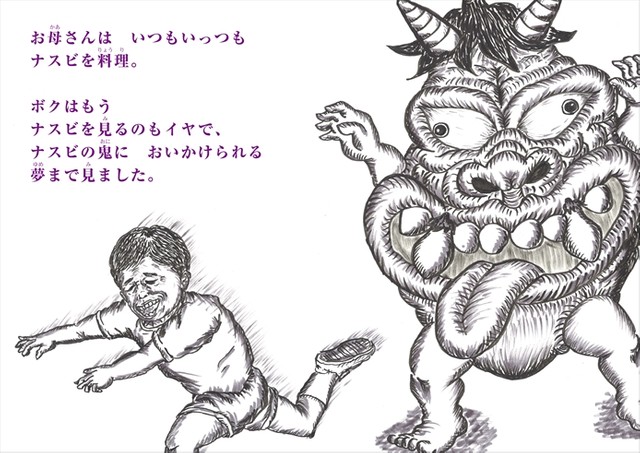 絵本『小学生のボクは、鬼のようなお母さんにナスビを売らされました。』フォト集