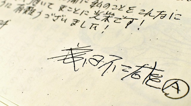 取材後、安孫子さんから、創作ノートにあった直筆のイラストが添えられたお礼のファクスが届いた。「故郷の富山の新聞で私のことを扱って頂いてまことに光栄です!」