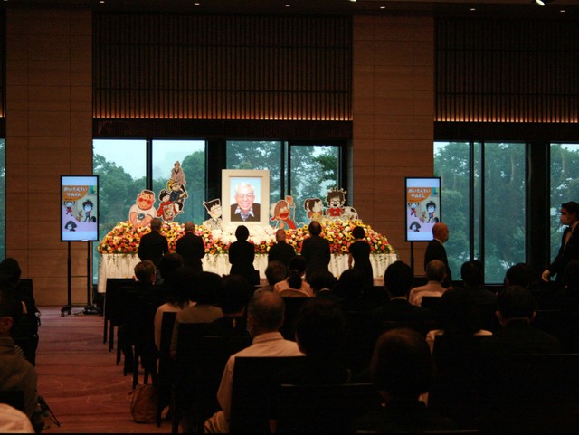 雨が降りしきる中、「那須正幹さんを偲ぶ会」に集まったのは親交のあった作家や編集者、親族ら約100人。生前の人柄にちなみ、「那須正幹さんを“明るく”偲ぶ会にしたい」という司会者の言葉で始まりました。累計2500万部を超える「ズッコケ三人組」シリーズの記念すべき第1作『それいけズッコケ三人組』の表紙をイメージして、祭壇は黄色い花で彩られ、遺影をハチベエ、ハカセ、モーちゃんらが囲みます。