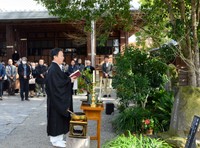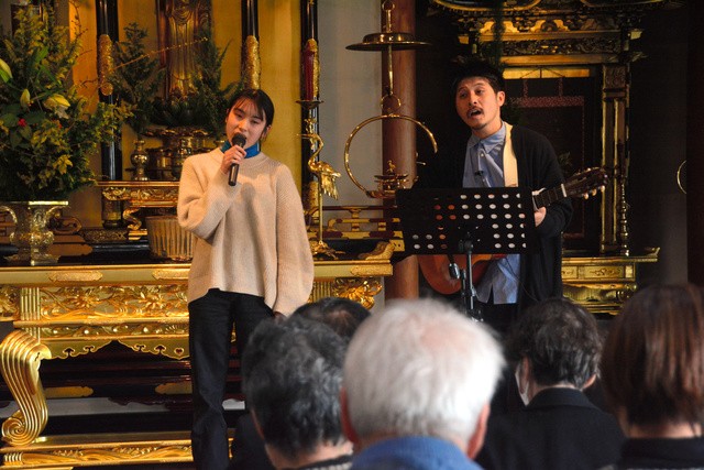 その後、本堂で、親交があった作家の坂口恭平さん(45)と長女のアオさん(15)が石牟礼さんの詩「海底の修羅」にメロディーをつけた曲などを歌った。