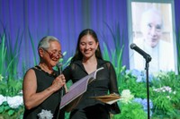 また、孫の夢佳さんは「私にとって一番大切な詩を読みたい」とし、1992年元旦の朝日新聞に掲載された「あかんぼがいる」を朗読した。祖父になった谷川さんが「孫」への思いをつづった詩で、夢佳さんは涙をこらえながら読み上げた。