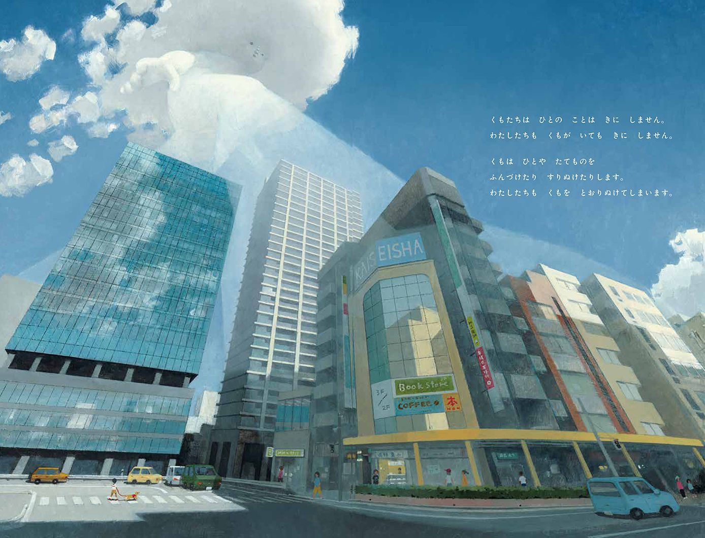 ――大きな空に悠々と浮かぶ、くも。「くもと めが あったことは ありますか? わたしはいちどだけ、あります」という一文から絵本ははじまります。くもたちは、遠くを見るように町を歩いていきます。子どもがそれをずっと見つめていますね。