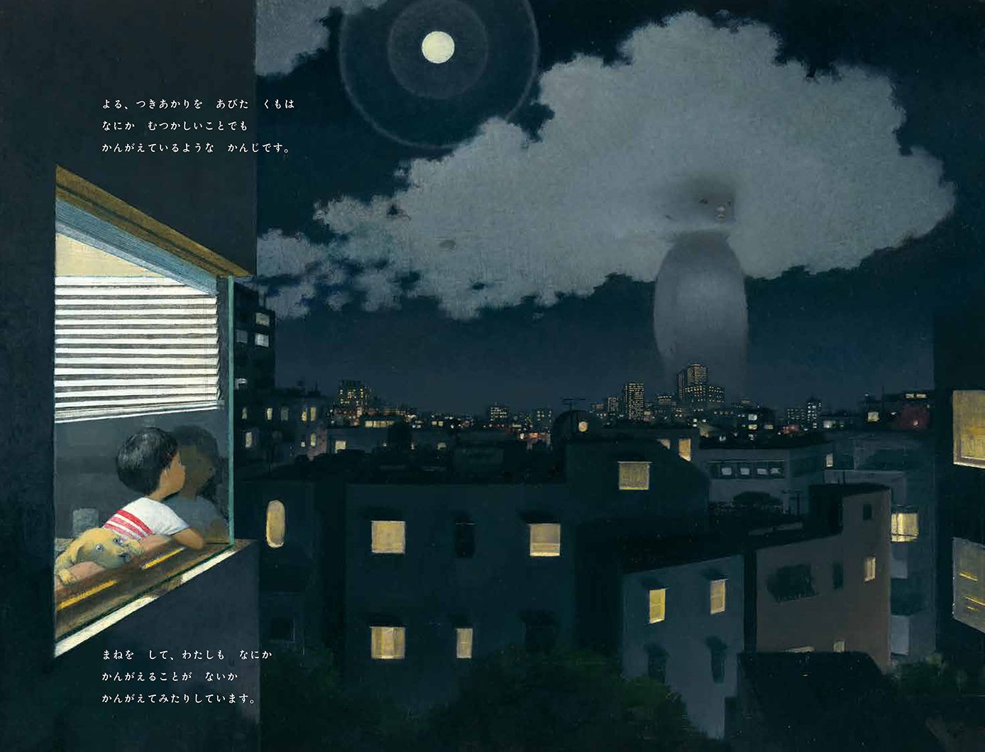 昔、埼玉に住んでいたときは、星がすごくよく見えたんですけど、都内に引っ越して、星がほとんど見えないかわりに、夜のくもがよく見えることに気づきました。地上の明かりで下から照らされるせいでしょうか。この絵本の子どももそんな場所の子だと想像してもらえればと思います。