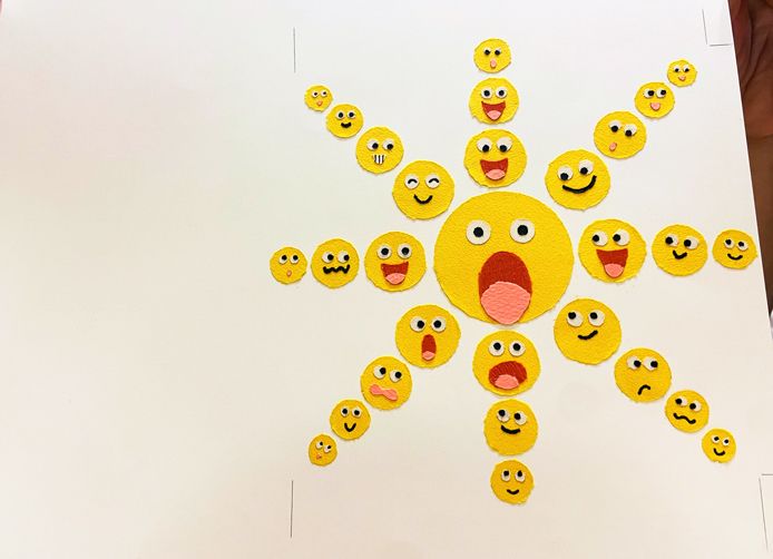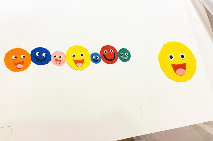 たとえば、見返しには白い“まる”がいくつもあるので、そこに顔を描いてもらってもいいですよね。「いろんな顔を描いて、友達をたくさん増やそう!」みたいな感じで。会場にいろんな色の“まる”を用意しておいて、好きな“まる”に顔を描いて、どんどん貼ってつなげていくのも楽しそうです。