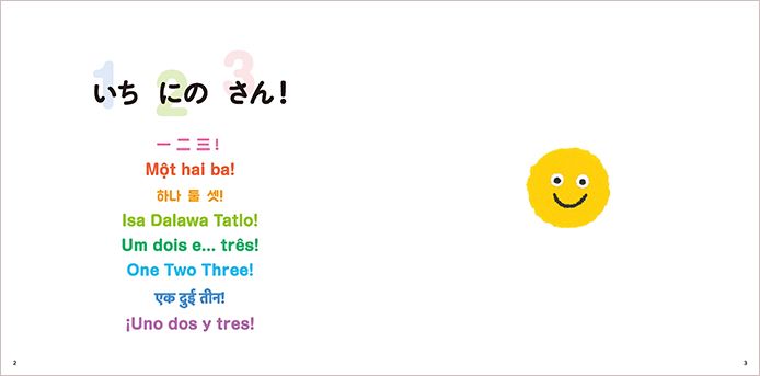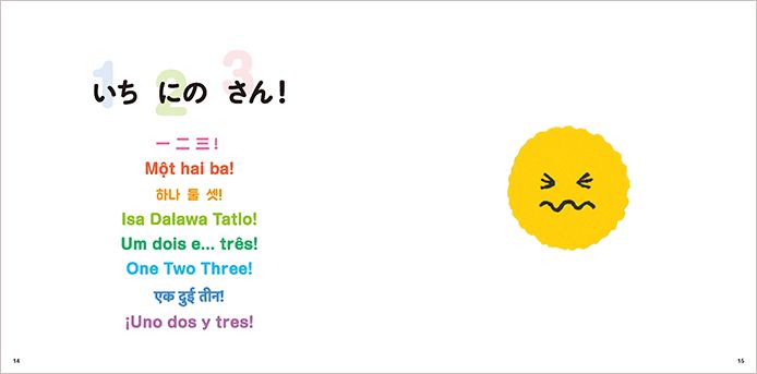 ページをめくると変化する、という繰り返しの構成も赤ちゃんには楽しいかなと。「いち にの さん!」という掛け声を選んだのは、数字を表す言葉なら、どの言語にも必ずあるから。みんなで声を合わせて楽しむ様子を思い浮かべながら、言葉を選んでいきました。