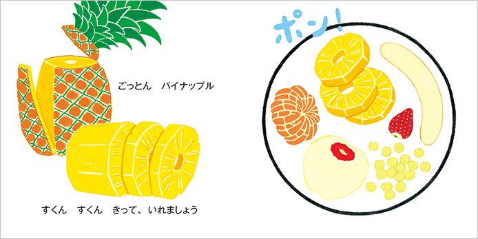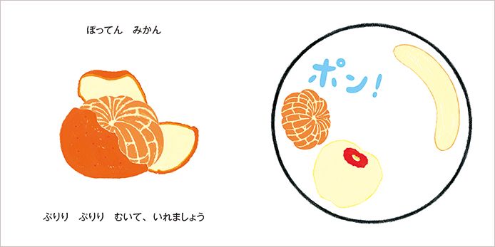 擬音語が決まるまでに苦労したのは、「みかん」と「パイナップル」ですね。みかんって実際に皮をむくとき、「ざぶざぶ」みたいな音がするんです。それで最初は「ざぶり ざぶり」にしたのですが、ちょっとイメージとかけ離れているし、もう少しかわいらしい音がいいと、ワークショップで訪れた幼稚園の子どもたちの意見も聞きながら、「ぶりり ぶりり」に。さらに「もっと語感を良く」と松田さんからアドバイスをいただき、「ぷりり ぷりり」に決まりました。