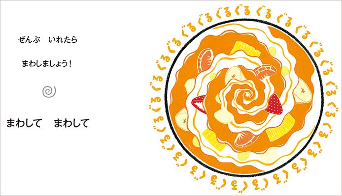 ——果物を「ポン!」と入れたり、クライマックスに「ぐるぐる……」と指を回したり。子どもと実際に「ジュースづくり」をしているような気持ちでコミュニケーションしながら読むのが楽しい。