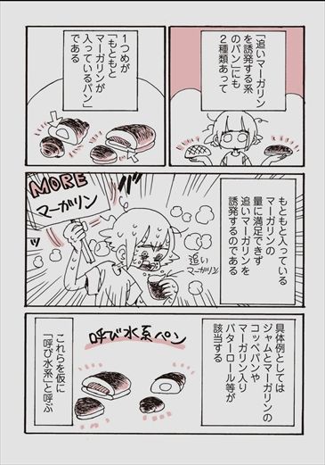 摂食障害を公表している作者の、食にまつわるコミックエッセイ。ぶよぶよにふやけた麺や米が好きだったり、菓子パンに「追いマーガリン」を塗ったり、こうしたあまり人に言えない、「食への偏愛」は誰にでもあるんじゃないだろうか。わたしも、カップ麺の類は汁がなくなるほどふやかす派だったりする。