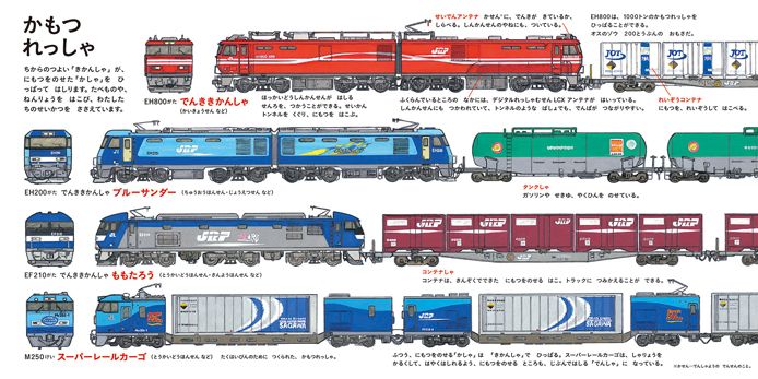 『でんしゃのずかん』に出てくる車両はどれも思い入れがあるのですが、新幹線の中では「かがやき」が好きです。色や形ががっこいいですよね。山手線は、この絵本を描いていたときにちょうど車両が新しくなって、ちょっと変わった顔の電車が出てきたなと思っていたので、新しくなるタイミングで描けたのは嬉しかったです。機関車も情緒がありますし、貨物列車も力強くていいですね。作品を制作するにあたり、専門家の近藤先生(早稲田大学先進理工学部・近藤圭一郎教授)にもお力添えいただいて、とてもありがたく思いました。