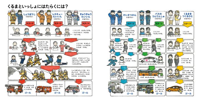 ――子どもの頃から図鑑が好きで、恐竜、昆虫、植物などの図鑑をよく眺めていたという五十嵐さん。『でんしゃのずかん』のほかにも『はたらくくるまのずかん』『きょうりゅうのずかん』など、子どもに人気のコレクションを「ずかん」シリーズの一部としてまとめている。どの作品も、関連する職業に就く方法がチャートとして紹介されている。