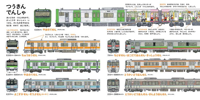 ――新幹線、特急列車、機関車、地下鉄……。乗り物好きにはたまらない車両がイラストでずらりと並ぶ『でんしゃのずかん』(白泉社)。身近な車両をピックアップして、実物そのままの色、形を手描きのイラストで表現。ライトや窓の数など、細かいところに気をつけながら、「かっこよさ」を一番大切に描いたというコレクション絵本だ。
