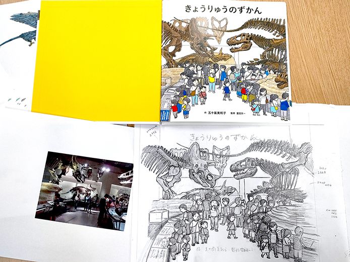 監修の先生に専門家ならではのご意見をいただいたり、編集部の方のご意見をいただいたり、専門書を読んだり、撮影のための取材をさせていただいたりすることもあります。『きょうりゅうのずかん』では、博物館の複製模型や専門書、科学番組の映像を参考にしつつ、監修の富田先生(爬虫類・恐竜研究家の富田京一さん)にチェックしていただいて、恐竜の色や形を決めていきました。
