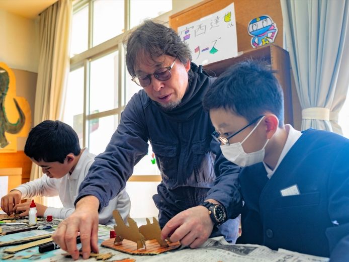 手本を見せる宮西さんの目は真剣で、小学生相手だからと妥協しない。子どもたちもそれぞれひとりのアーティストなのだ。