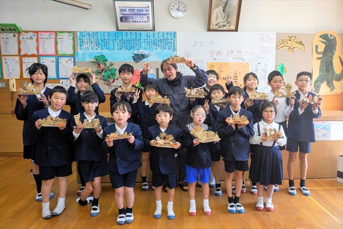 見たことのない光景にテンションがあがった宮西達也さん、「今日は何はさておき、自慢話をしにきました」と、1~6年の全校生徒16人と参観の保護者を笑わせた。