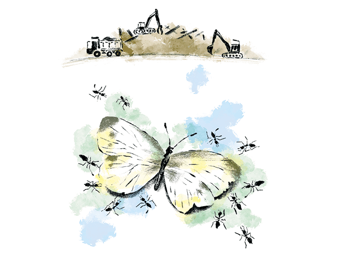 モンシロチョウの白いはねを、アリが小さなアゴでくわえてヨットの帆のように運んでいく光景や、コオロギの節くれだったうしろ脚が、長いアリの行列の上を縦になったり、平らに寝たり、ちょこまかと踊るように流れていく、そんな光景を見た記憶もあります。
