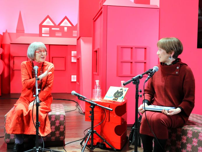 まず画家が自由に描き、そこから着想を得て手紙形式の文を考えた、角野さんにとって思い出深い絵の数々。23日には同館で絵本評論家の広松由希子さんとの対談イベントも開かれた。規格も手法もさまざまな絵に広松さんは「すごくのびのびと描かれてますよね」と感嘆。「みんな冒険してくださった」と角野さん。