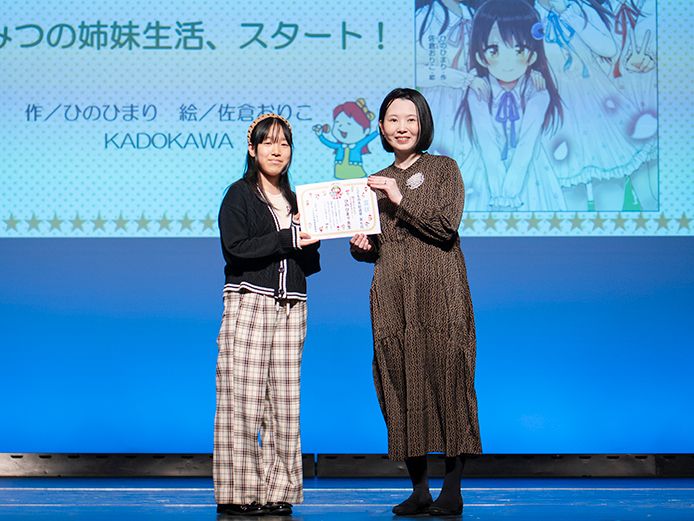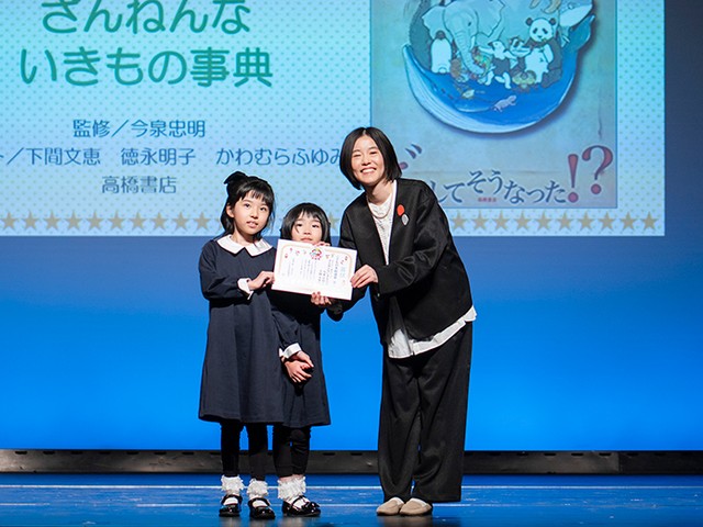 第6位に選ばれたのは、毎回ベスト10に入る人気作品『おもしろい!進化のふしぎ ざんねんないきもの事典』(監修:今泉忠明 絵:下間文恵、徳永明子、かわむらふゆみ 高橋書店)。姉妹のこどもプレゼンターから、絵を担当された下間文恵さんに表彰状が贈られました。