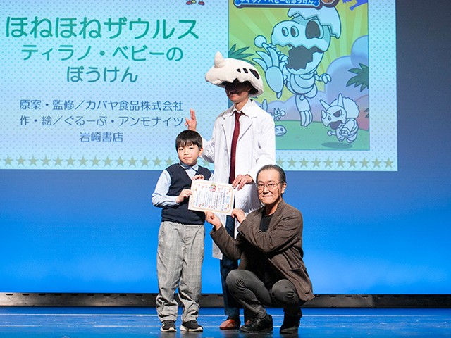 第9位には、カバヤ食品の人気玩具菓子「ほねほねザウルス」から生まれた冒険物語『ほねほねザウルス ティラノ・ベビーのぼうけん』(原案・監修:カバヤ食品株式会社 作・絵:ぐるーぷ・アンモナイツ 岩崎書店)が、前回に引き続きランクイン。ぐるーぷ・アンモナイツの今井修司さんと、ほねほねザウルス開発者のドクター・ヨッシーさんが登壇しました。