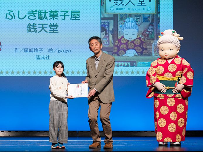 第10位には、『ふしぎ駄菓子屋 銭天堂』(作:廣嶋玲子 絵:jyajya 偕成社)が選ばれました。2013年の刊行以来、テレビアニメや舞台、ゲーム、アトラクション、実写映画など様々なメディアミックスでも話題となった読み物シリーズの1作目です。同作の主人公・紅子さんもお祝いに駆けつけ、会場を賑わせました。