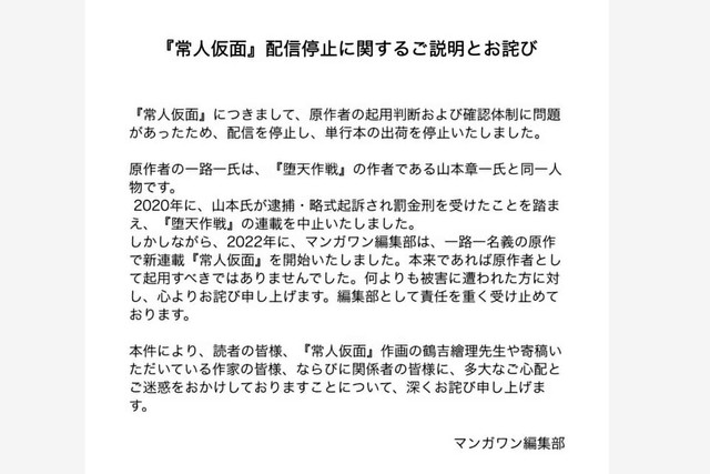 その後、22年10月1日、マンガワンのウェブサイト上には、同月末をもって作品の配信自体を終了する旨が掲載された。