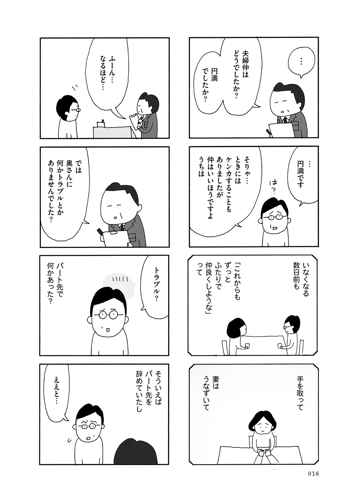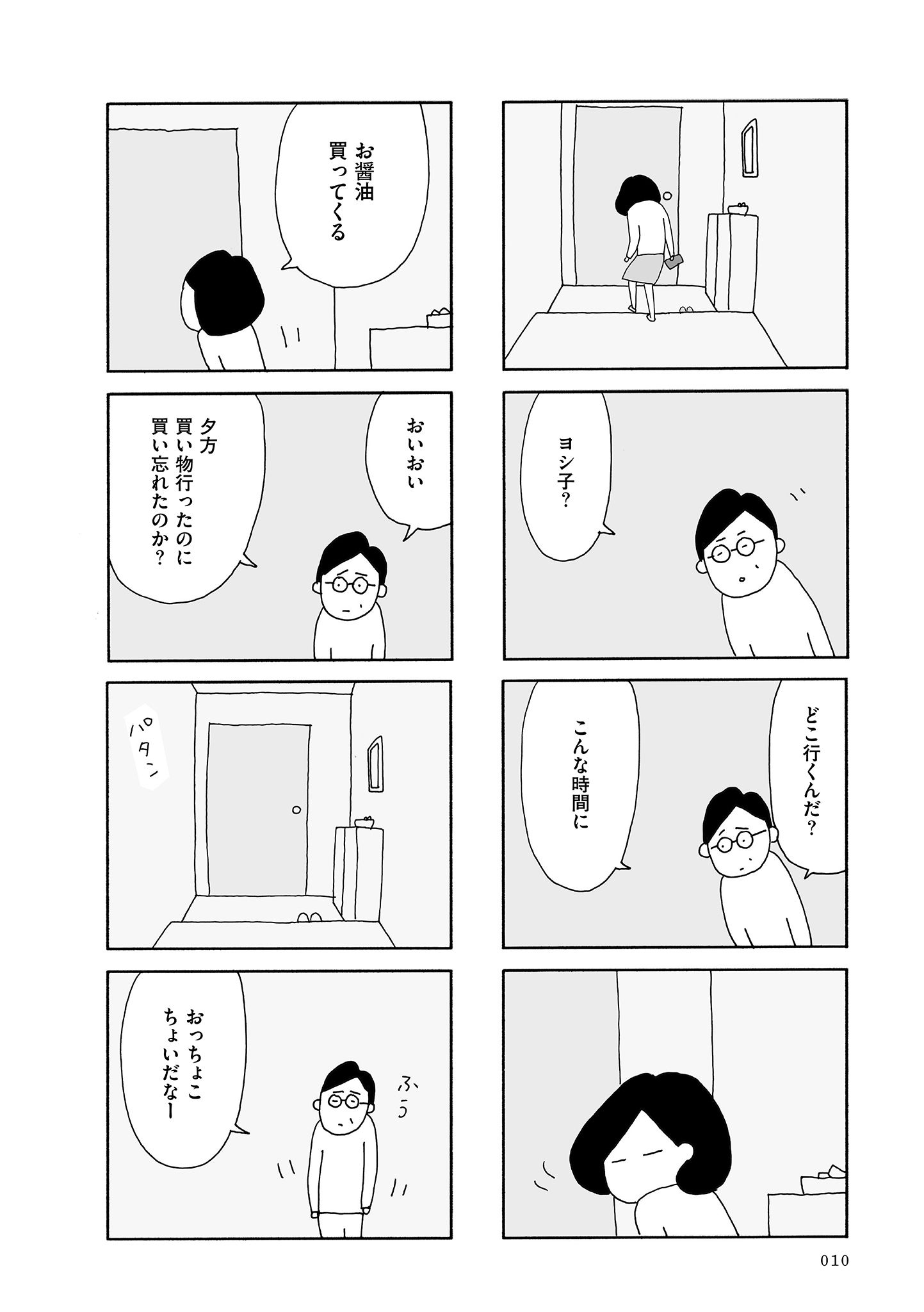 ――妻のヨシ子は「お醤油を買いに行ってくる」と言い残し、そのまま失踪してしまいます。この「お醤油」という言葉が絶妙で「日常」から「逃避」する様子が伝わってきます。