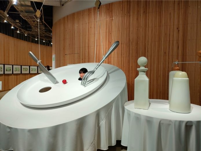 絵本のワンシーンを再現したフォトスポットは、リンゴがひとつのった巨大皿。安野さんが作画を手がけた『おおきな ものの すきな おうさま』(講談社)に出てくる、なんでも大きいものを作らせる王様の食事風景です。穴の中から顔を出してみると、その滑稽な感じが実感できますね。