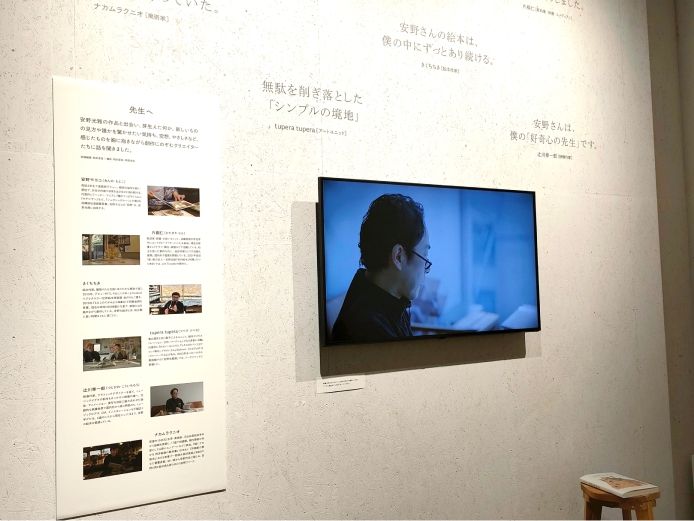 「先生へ」と題して、現代のクリエイターが安野作品について語ったインタビュー映像は、展覧会場の序盤で流れています。参加クリエイターは、安野モヨコさん、片桐仁さん、きくちちきさん、tupera tuperaさん、辻川幸一郎さん、ナカムラクニオさんの6名です。子どもの頃に作品を見た衝撃、職人としてのすばらしさ、自身の作品にも影響を与えた絵本など、安野さんへの深い想いを語っています。