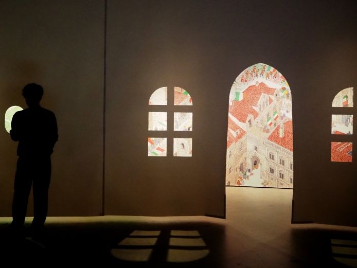 旅人の目線で暮らしや歴史を描いた名作「旅の絵本」シリーズ(福音館書店)は、安野さんのベストセラー作品のひとつです。本展では原画のほか、絵本の風景を3m×50mの壁に引き伸ばして、まるでそこに街があるかのように感じられるよう展示。「旅の絵本」シリーズ制作のきっかけとなった「飛行機が着陸する前の、期待に満ちた風景を見て」という言葉に着想を得て、飛行機の窓や家の窓越しに街を覗き込む体験ができる仕掛けが作られています。
