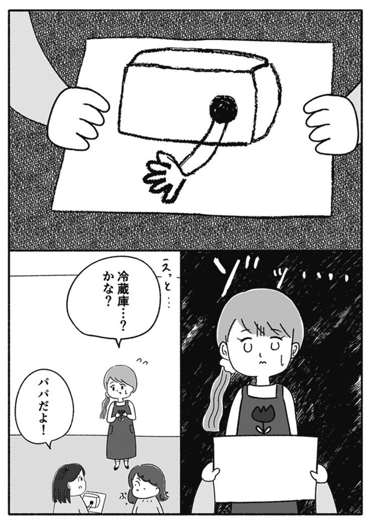 「箱に入った男の死体が発見された」――そんなニュースから物語は始まり、そして巻き戻る。主人公の由美子が、幼稚園で描いた「かぞくのえ」で先生を戦慄させてしまう場面へと。箱に空いた黒い穴と、そこからにゅっと伸びた腕。「パパだよ!」と無邪気に言う由美子。ホラー好きとしてはここでもう掴まれた。子どもが描いた拙くも恐ろしい絵はホラーの小道具としては定石だからだ。きっと何かの暗示や象徴に違いない……と読み進めていくと、由美子の描いたとおりの「パパ」が登場する。リビングに設置された大きな箱の中から腕だけを伸ばし、食事を取るパパ。ぐっと親指を立てて感情を表すパパ。由美子の頭を撫でるパパ。穏やかでやさしいパパと、同じようにやさしいママ。